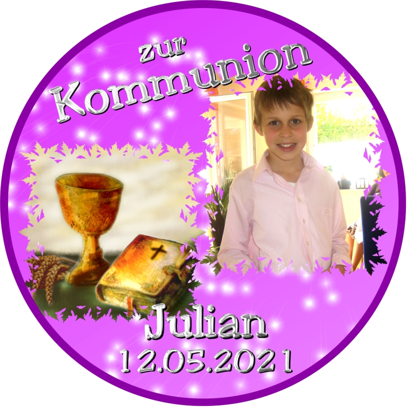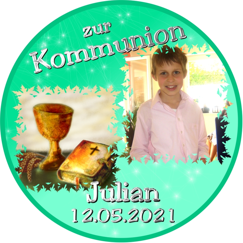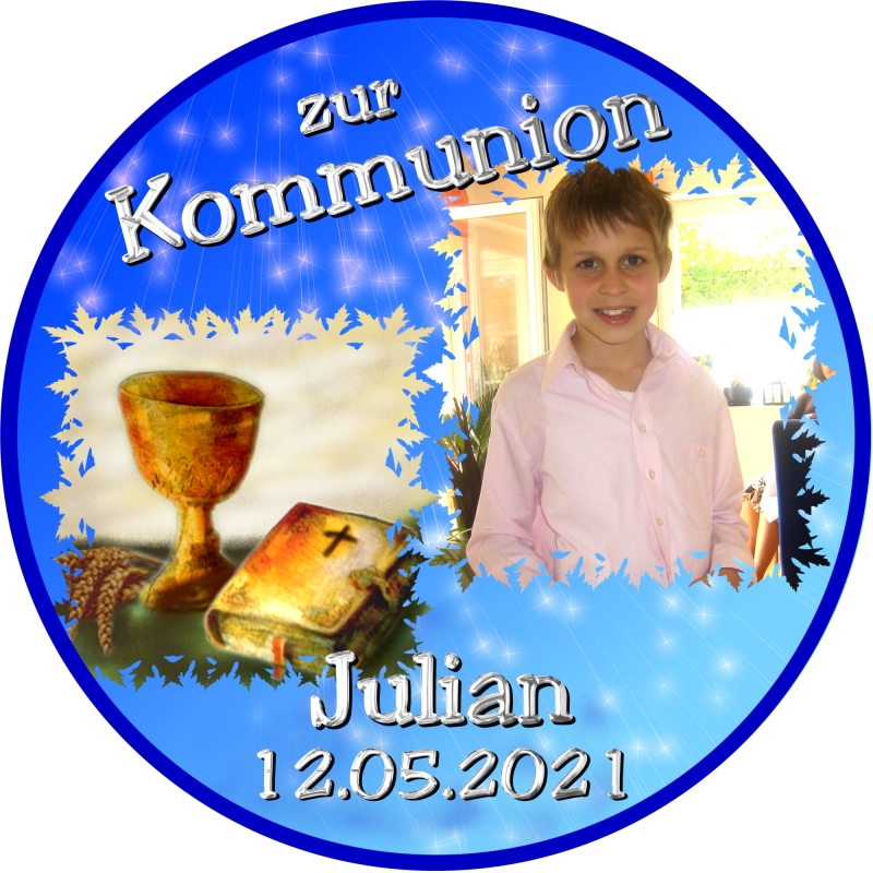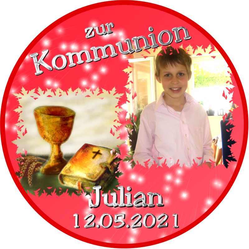 Für Kommunion, Konfirmation, Firmung, Jugendweihe oder ähnliche Anlässe. Durch den frei bestimmbaren Text kann dieser Aufleger für jedes dieser Feste erstellt werden.