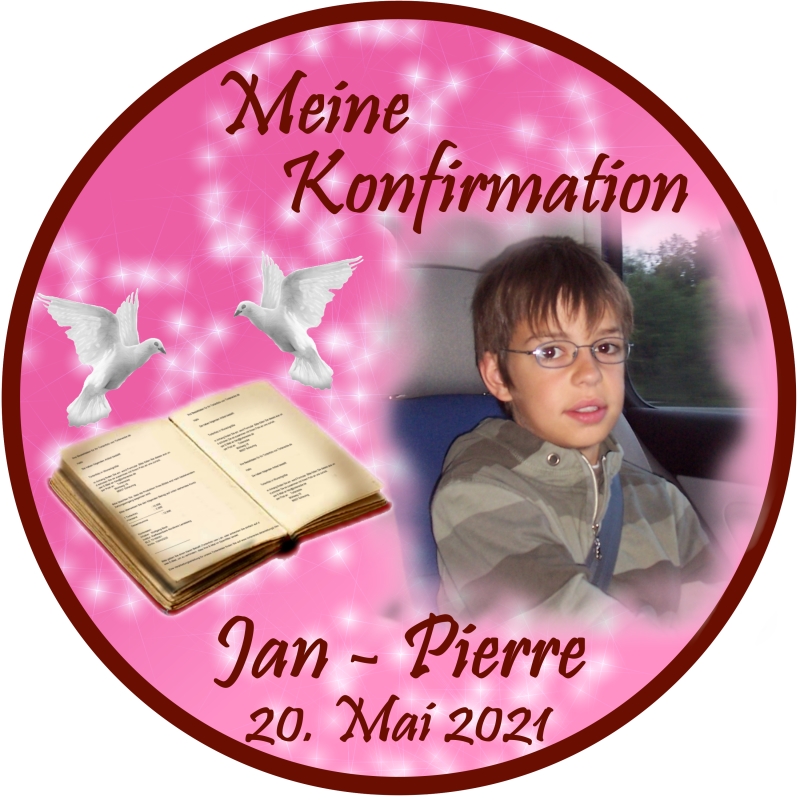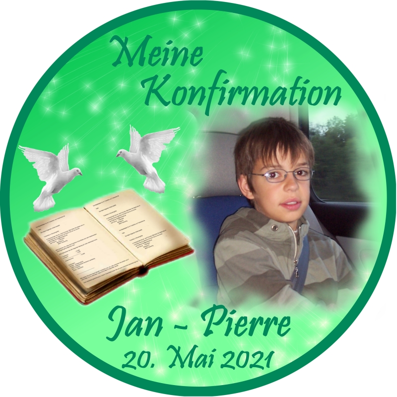 Für Kommunion, Konfirmation, Firmung, Jugendweihe oder ähnliche Anlässe. Durch den frei bestimmbaren Text kann dieser Aufleger für jedes dieser Feste erstellt werden.