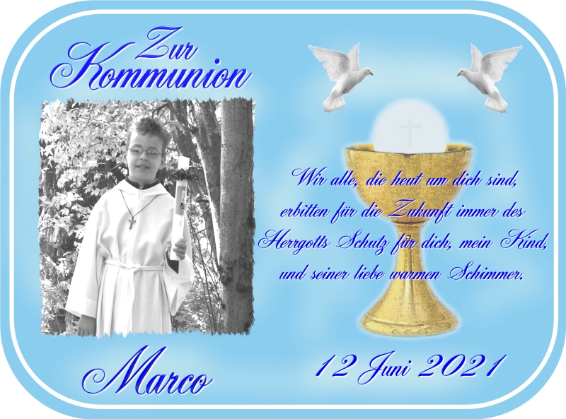 Für Kommunion, Konfirmation, Firmung, Jugendweihe oder ähnliche Anlässe. Durch den frei bestimmbaren Text kann dieser Aufleger für jedes dieser Feste erstellt werden.